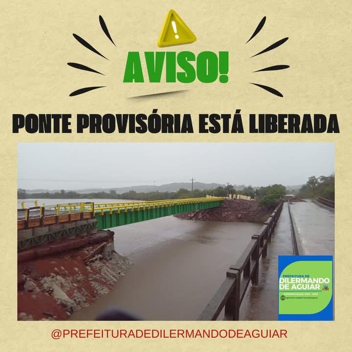 A Prefeitura Municipal de Dilermando de Aguiar informa que o tráfego de veículos na ponte provisória está liberado na ERS-530, no km 104, na divisa com o município de São Pedro do Sul. A ponte instalada no local pela administração municipal está em pleno funcionamento, garantindo a passagem segura dos condutores.