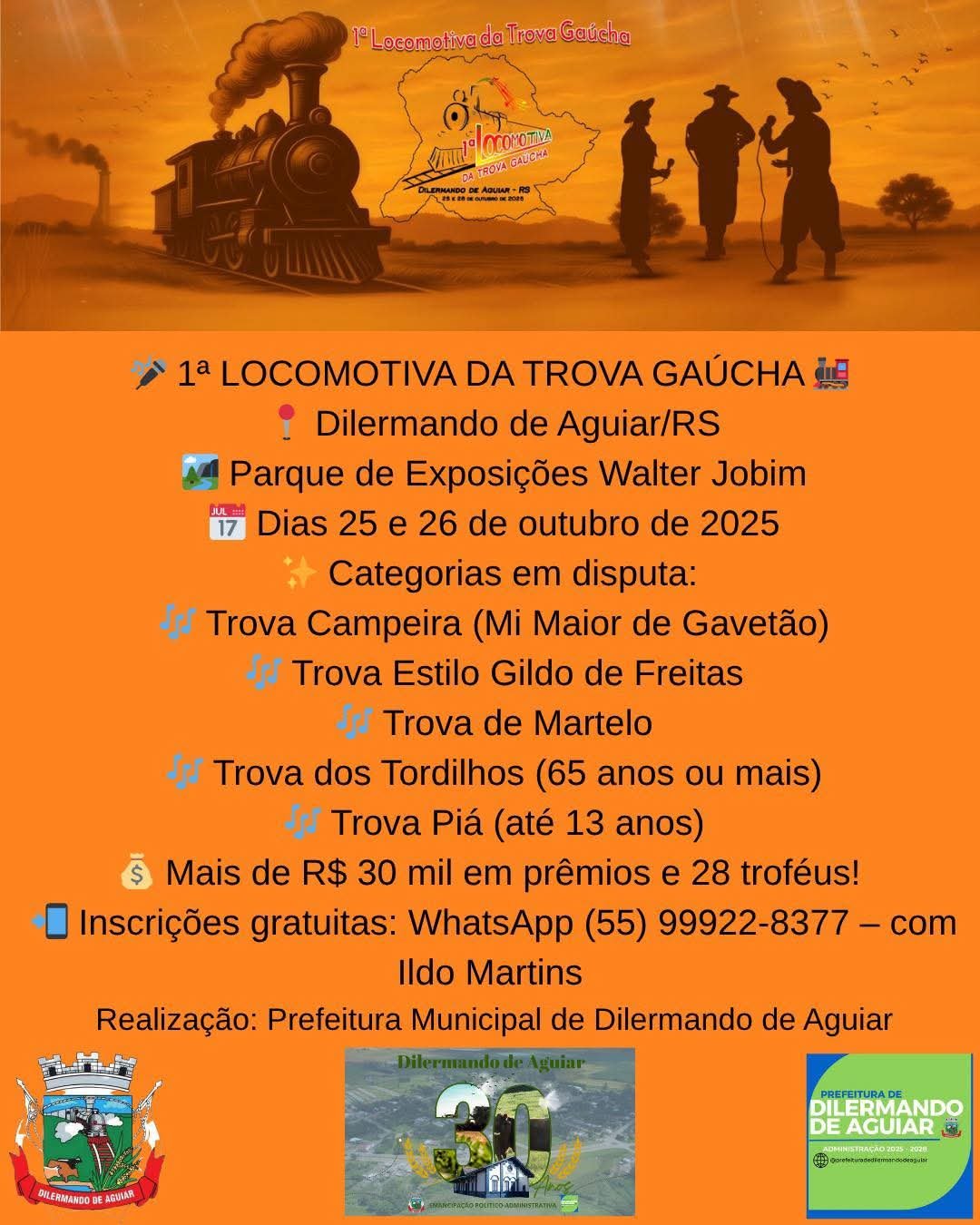Vem aí a 1ª Locomotiva da Trova Gaúcha, um grande encontro de talentos e tradição em Dilermando de Aguiar! O evento acontece nos dias 25 e 26 de outubro de 2025, no Parque de Exposições Walter Jobim, e promete reunir trovadores de todas as idades em diversas categorias: Campeira, Estilo Gildo de Freitas, Martelo, Tordilhos (65+) e Piá (até 13 anos). Serão mais de R$ 30 mil em prêmios e 28 troféus! 🏆