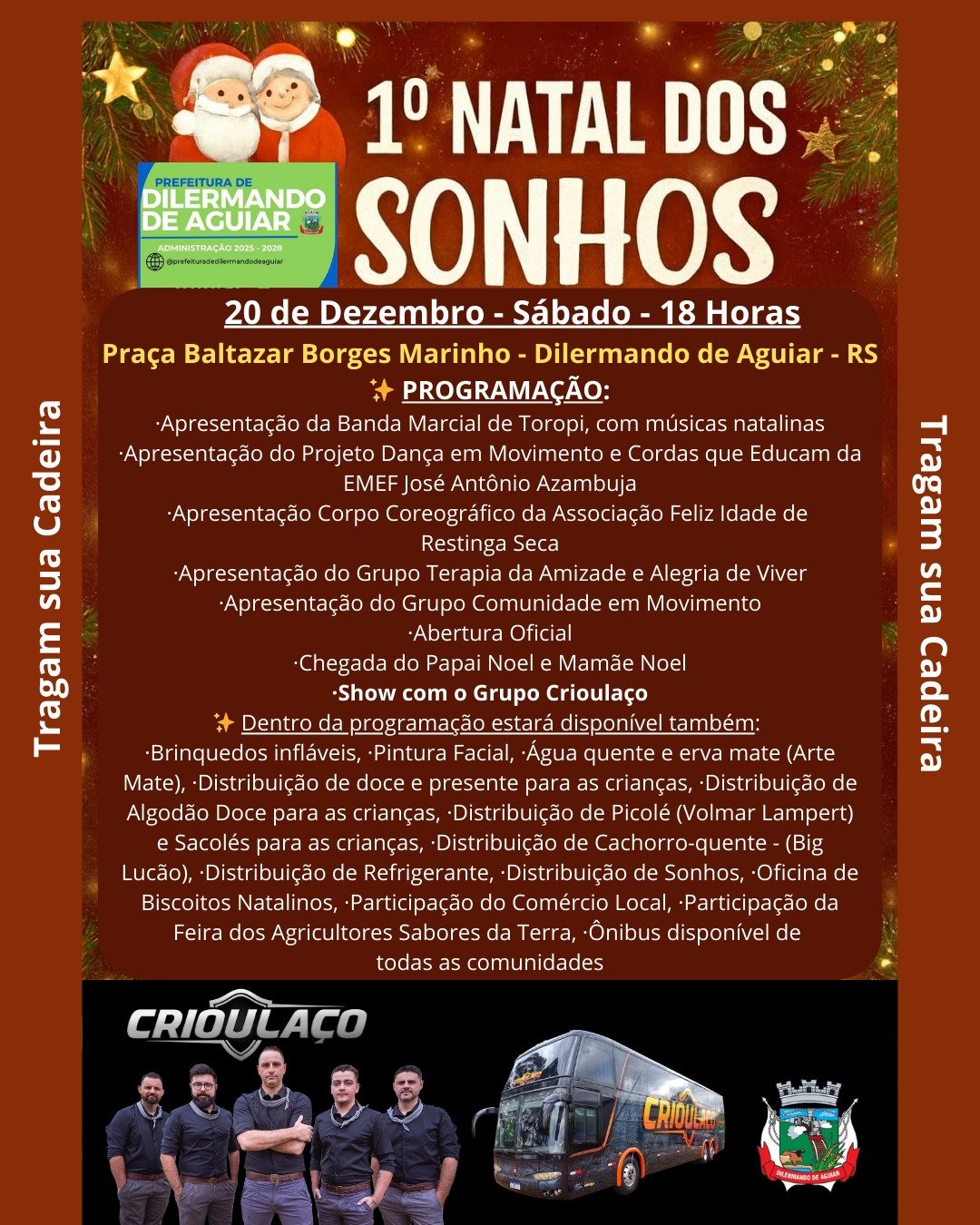 A Prefeitura Municipal de Dilermando de Aguiar e a Comissão Organizadora têm a alegria de convidar toda a comunidade para celebrar o 1º Natal dos Sonhos, um momento mágico preparado com muito carinho para todas as famílias.