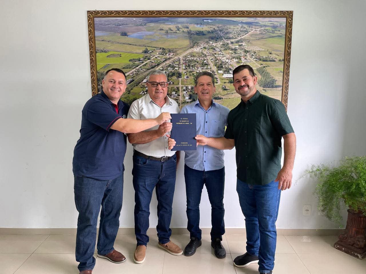 Na manhã desta terça-feira, 30 de dezembro, o prefeito Jorginho Saidelles e o vice-prefeito Marcelo Dotto receberam os vereadores Jairo Leal da Silva, atual presidente e Renato Fernandes de Mello, presidente eleito para o exercício de 2026 da Câmara de Vereadores de Dilermando de Aguiar, que realizaram a entrega oficial da Lei Orgânica do Município. O encontro marcou um momento de relevância institucional, reforçando o compromisso com a organização administrativa e o fortalecimento das bases legais do município.