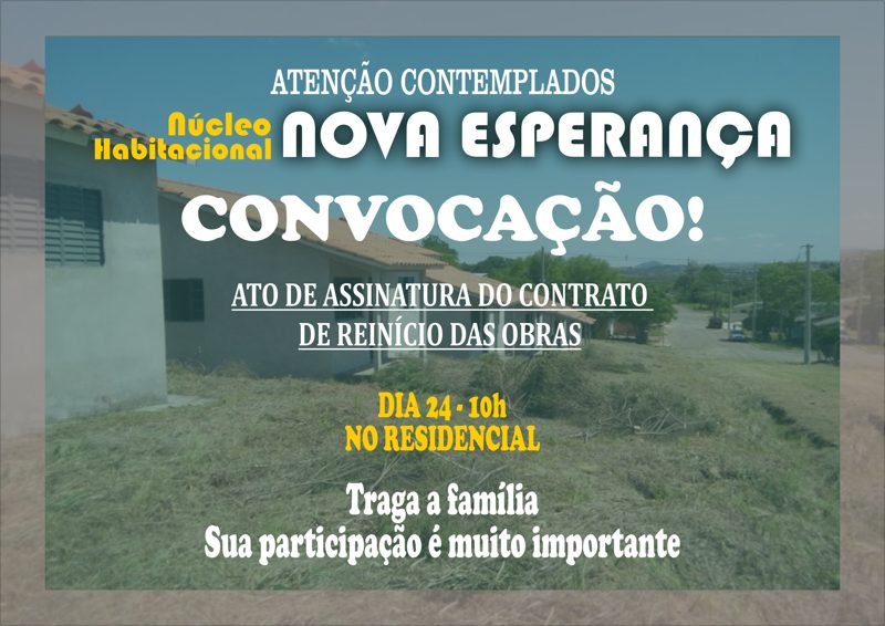 Será retomada, após várias tratativas, a construção de 40 moradias da Cohab Nova Esperança. A assinatura do contrato com o Sicredii e a empresa Rafael Bayer Projetos e Execuções acontecerá às 10h desta sexta-feira, 24 de novembro. A secretária de assistência social, Luciane Trindade e o presidente do Conselho municipal de Habitação, Upiragibe Ferrari Pinheiro convocam os contemplados para a cerimônia.
