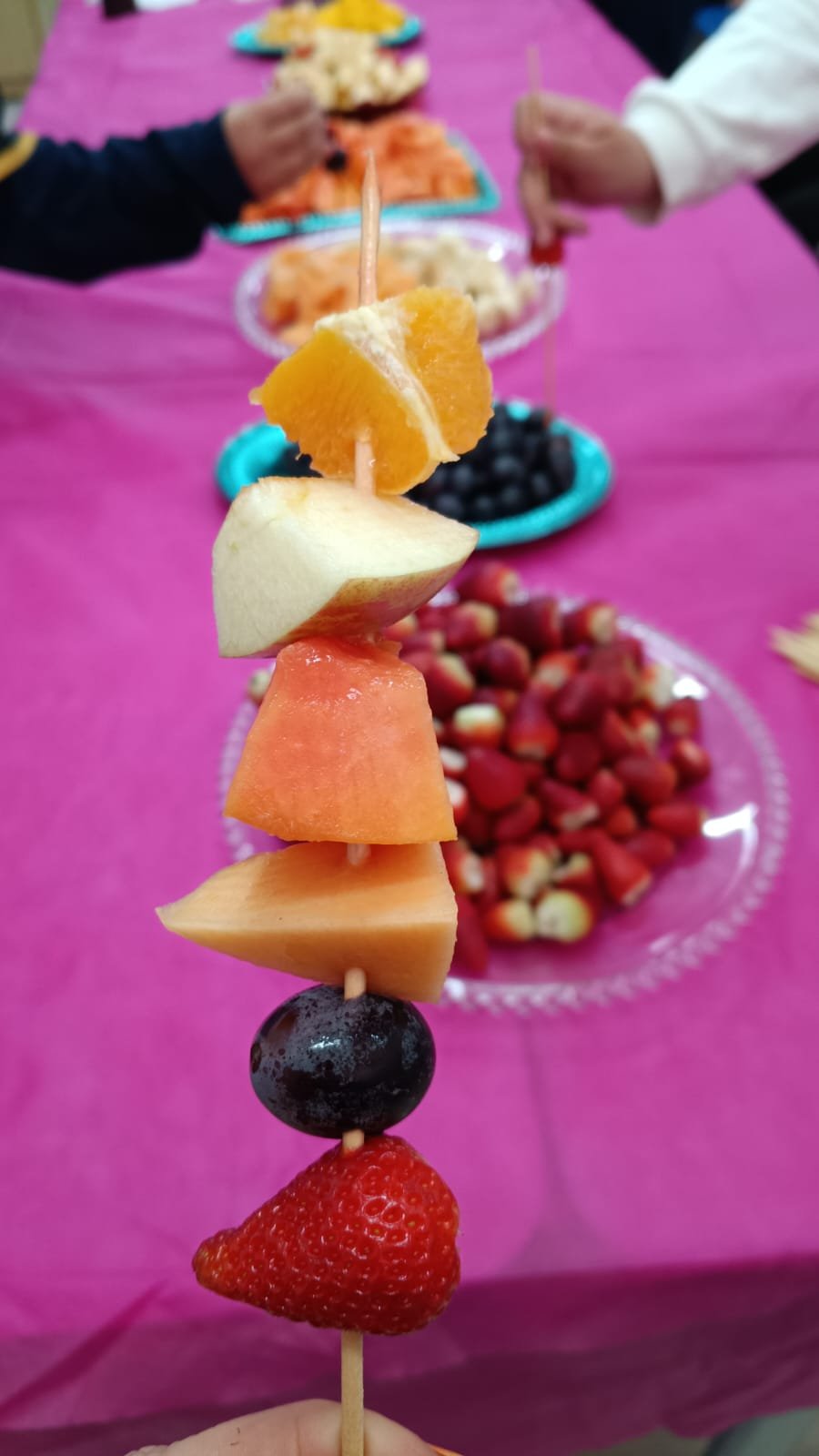 Com entusiasmo, os pequenos prepararam seus próprios espetinhos coloridos, escolhendo entre banana, maçã, laranja, mamão, morango, uva e manga. Cada combinação era única e cheia de cores, despertando o interesse das crianças por alimentos naturais. A atividade também incentivou o trabalho em equipe e a criatividade, transformando o momento em uma verdadeira celebração do aprender fazendo.