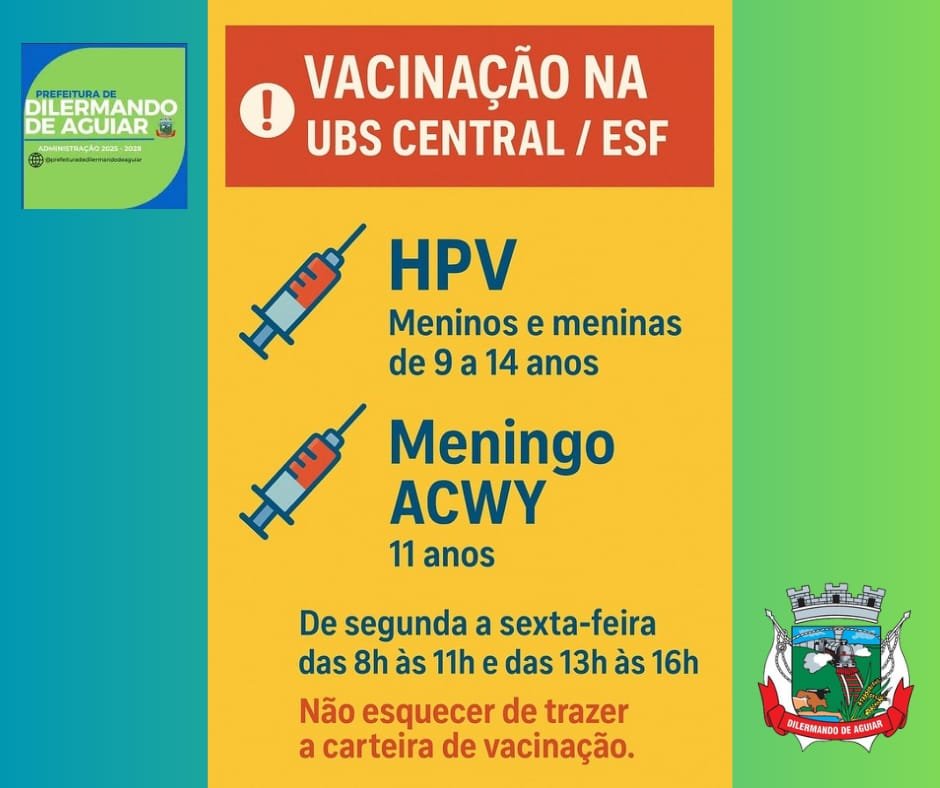 Você sabia que o HPV está relacionado a mais de 72 mil casos de câncer por ano no Brasil? E que 70% dos casos de câncer de colo do útero são causados por esse vírus? 💉 HPV – Meninos e meninas de 9 a 14 anos 💉 Meningo ACWY – Crianças de 11 anos 🗓️ De segunda a sexta-feira ⏰ Das 8h às 11h e das 13h às 16h