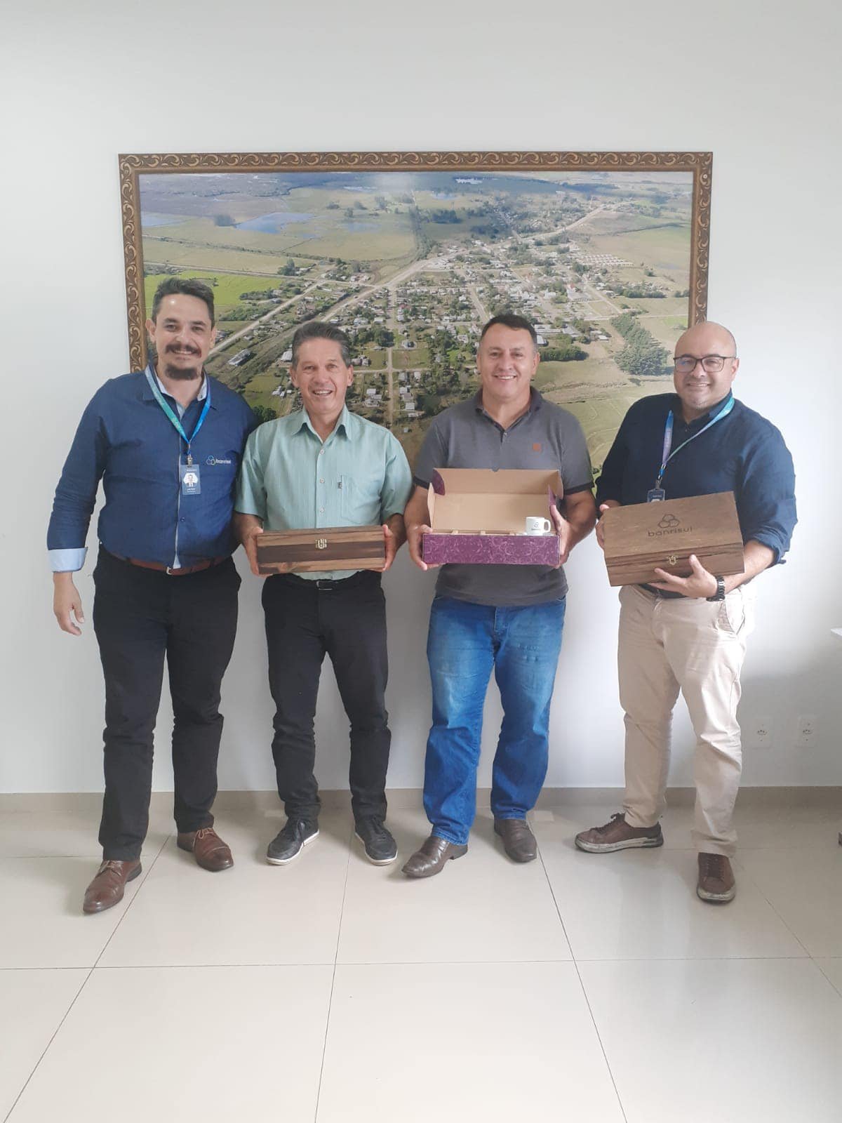 Na tarde da última quinta-feira (27), o prefeito de Dilermando de Aguiar, Jorginho Saidelles, e o vice-prefeito, Marcelo Dotto, receberam a visita de Luiz Eduardo Lima, gerente de governos, e Júlio Silva, gerente da agência do Banrisul no município. O encontro teve como pauta a apresentação de planos e serviços da agência.