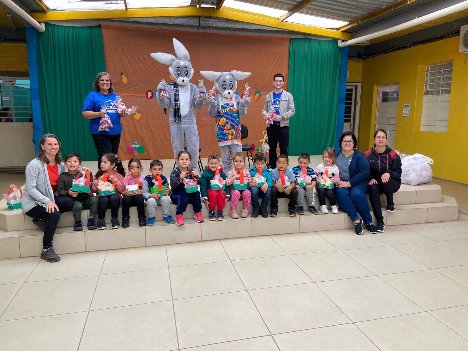 Na manhã de quinta-feira (17), a EMEF Valentim Bastianello viveu um momento especial com a visita dos coelhos Pascoal e Domingas. A dupla animada chegou levando alegria, sorrisos e muitos doces para a criançada, celebrando o espírito da Páscoa com muito carinho e diversão.