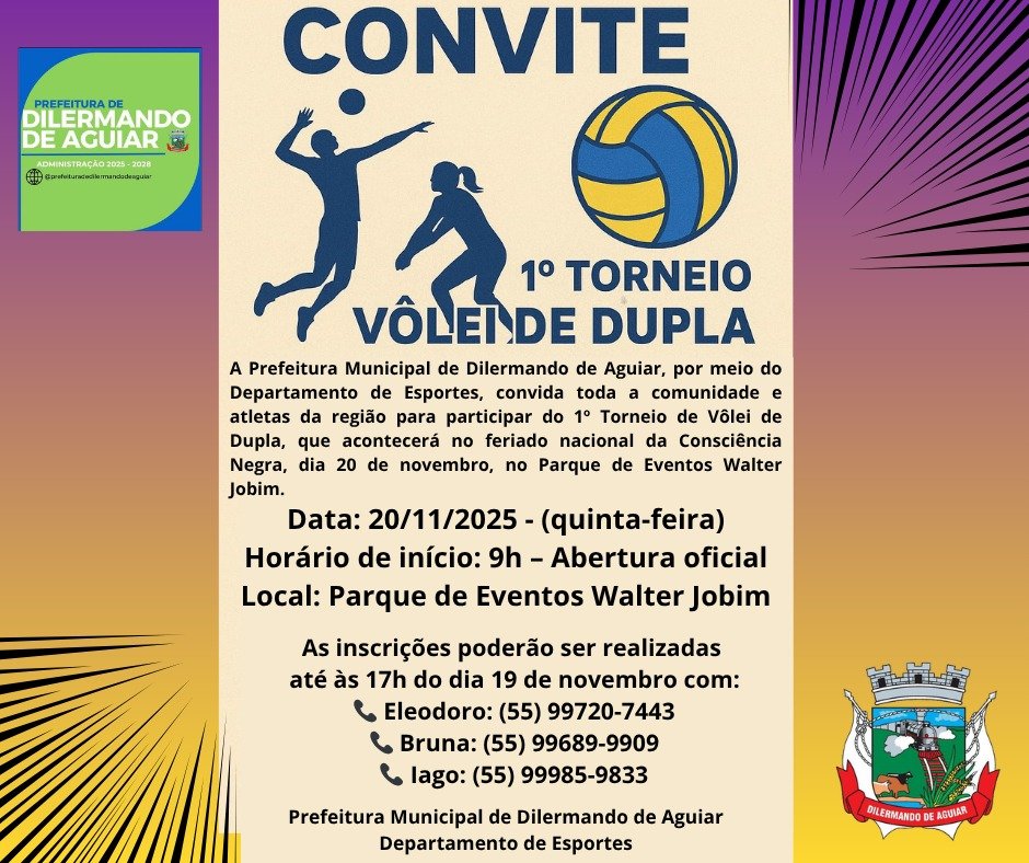 A Prefeitura Municipal de Dilermando de Aguiar, por meio do Departamento de Esportes, convida toda a comunidade e atletas da região para participar do 1º Torneio de Vôlei de Dupla, que acontecerá no feriado nacional da Consciência Negra, dia 20 de novembro, no Parque de Eventos Walter Jobim.