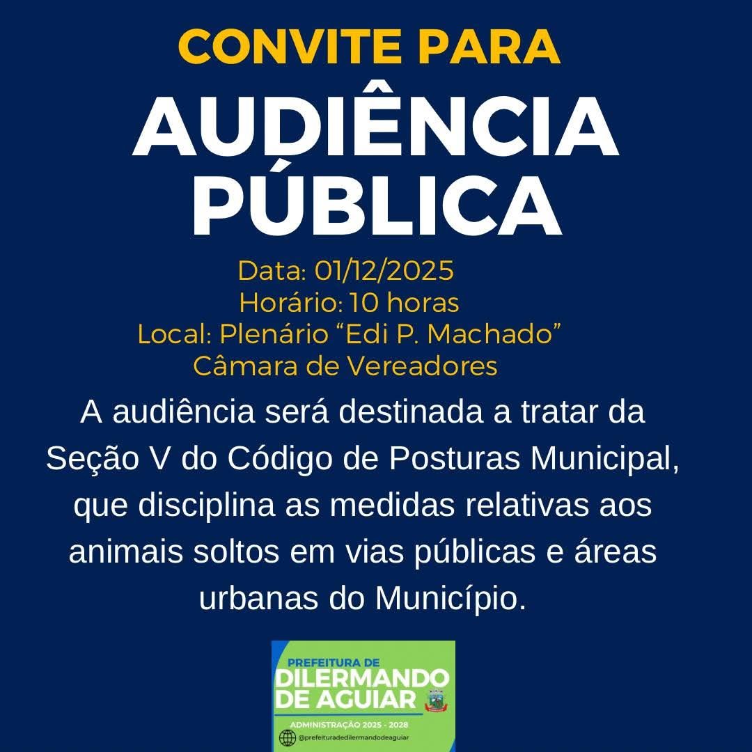 A Administração Municipal de Dilermando de Aguiar convida toda a comunidade para participar da Audiência Pública que será realizada no dia 1º de dezembro de 2025 (segunda-feira), às 10 horas, na Câmara Municipal de Vereadores de Dilermando de Aguiar.
