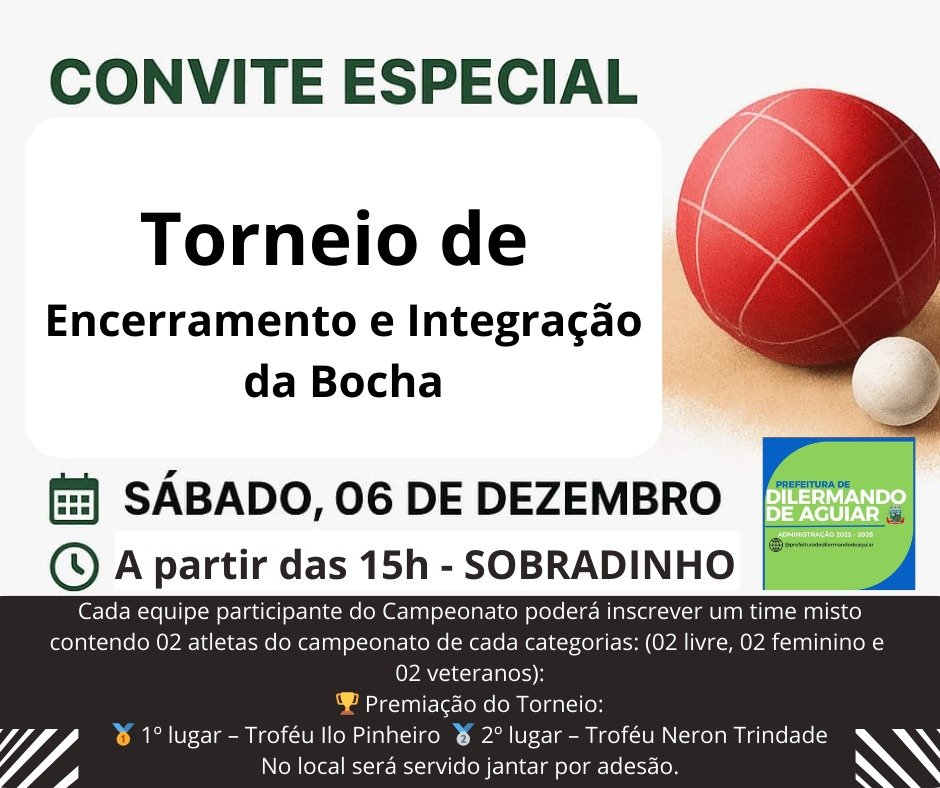 🕖 Às 19h, será realizada a Solenidade Oficial de Entrega da Premiação aos Campeões, Vice-Campeões e Terceiros Colocados do Campeonato Municipal de Bocha de Dilermando de Aguiar 2025, e os destaques de melhor batedor, meio e ponteiro da categoria livre e melhor jogador (a) na categoria veterano e feminino, um momento de reconhecimento ao empenho e dedicação de todos os atletas envolvidos.