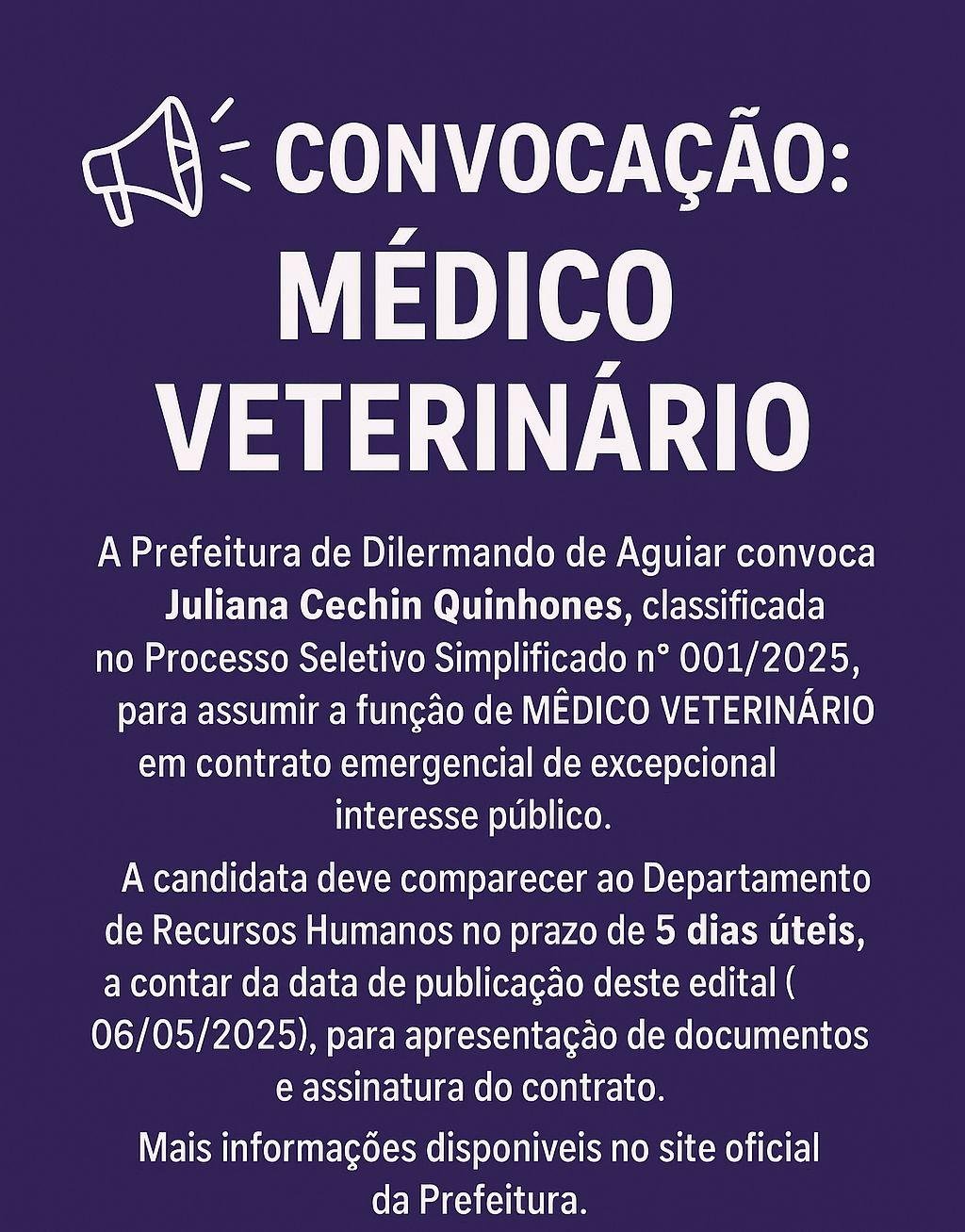 A Prefeitura de Dilermando de Aguiar convoca Juliana Cechin Quinhones, classificada no Processo Seletivo Simplificado nº 001/2025, para assumir a função de Médico Veterinário em contrato emergencial de excepcional interesse público.