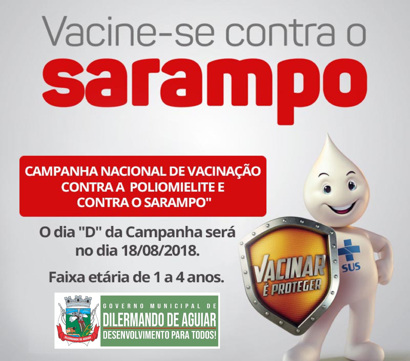 A Secretaria Municipal da Saúde de Dilermando de Aguiar, realizará, neste sábado, dia 18 de agosto, o dia dia de mobilização da Campanha Nacional de Vacinação contra a Poliomielite e contra o Sarampo. Todas as crianças do município, de um ano até quatro anos, 11 meses e 29 dias, devem receber a vacinação.