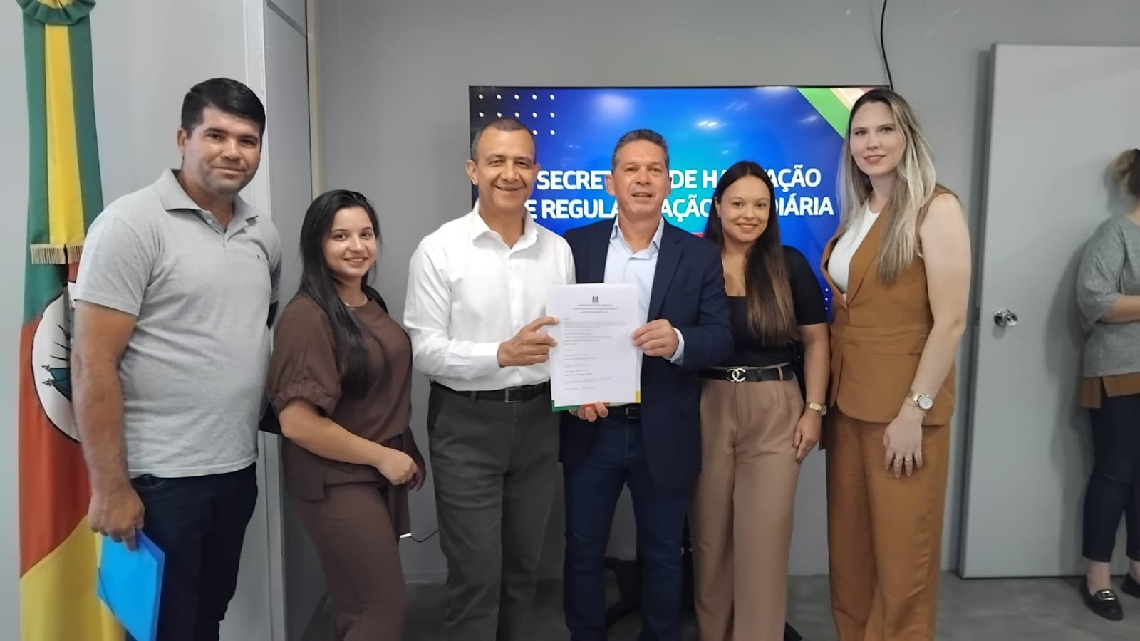 Durante a manhã, a equipe acompanhou o ato de assinatura do convênio do programa “Mais Água RS”, firmado com o secretário de Habitação e Regularização Fundiária, Carlos Gomes. A reunião ocorreu na sala da Sehab, no 14º andar do Centro Administrativo Fernando Ferrari (CAFF).