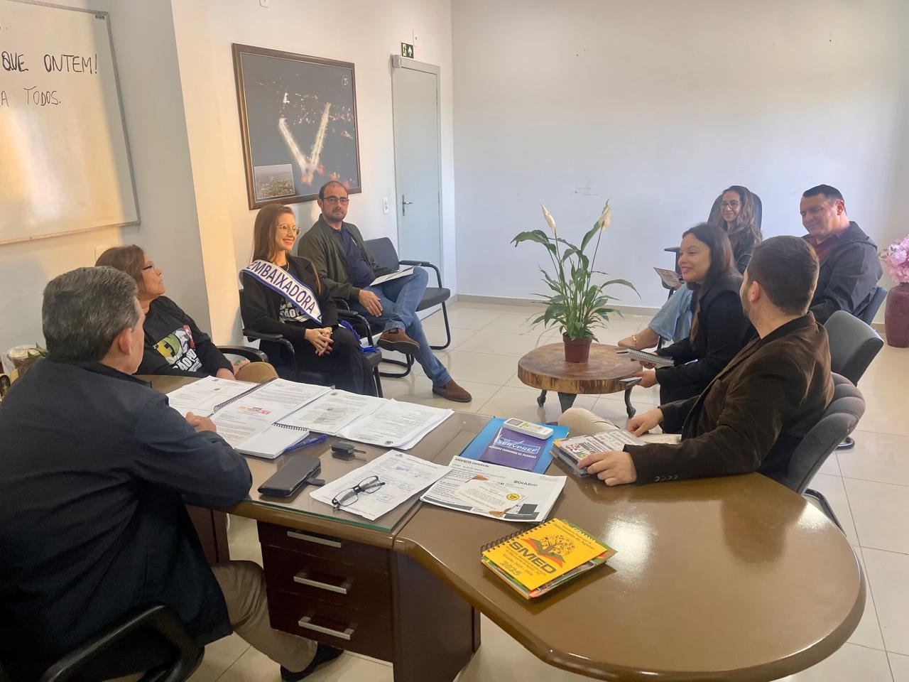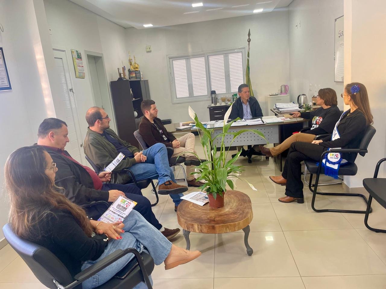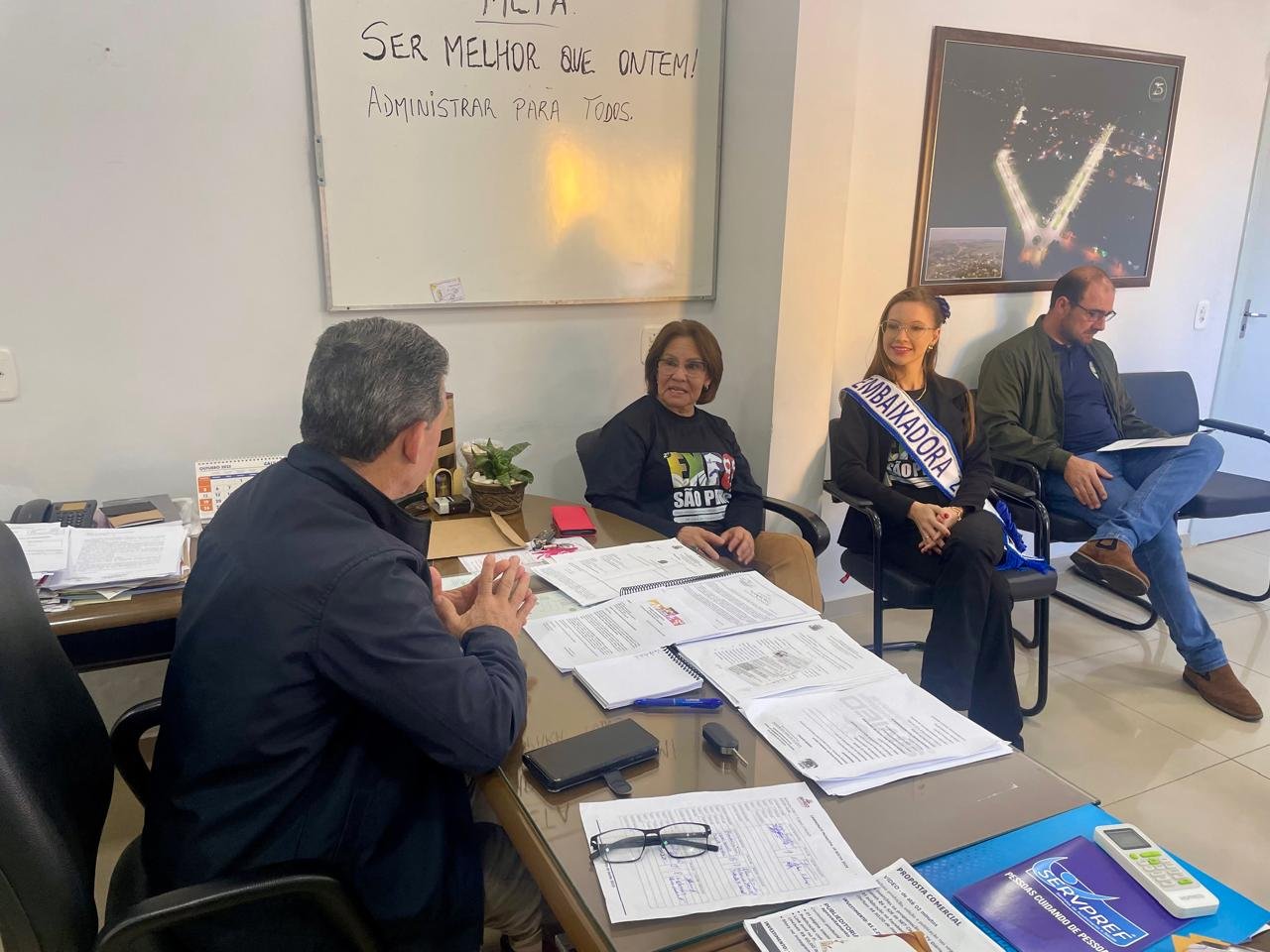 Na manhã de segunda-feira, 29 de setembro, o prefeito Jorginho Saidelles e o vice-prefeito Marcelo Dotto, receberam uma comitiva que trouxe consigo um convite especial. Os Embaixadores da 2ª Expo São Pedro 2025, Henrique Oleques e Elisa Stein, acompanhados da secretária de agricultura de São Pedro do Sul, Regina Helena Santarem Hernandes, estiveram no gabinete municipal de Dilermando de Aguiar para formalizar o convite oficial ao evento. Também estavam presentes o secretário de agricultura Marcelo Bianchini, a diretora da secretaria de educação Marta Mello e a assessora jurídica Stéfani de Moraes.