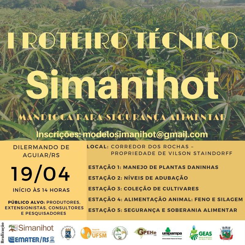 O evento acontecerá no próximo dia 19 de abril, quinta-feira, a partir das 14h, na propriedade de Vilson Staindorff, no Corredor dos Rochas, e contará com 5 estações (conforme imagem). As inscrições para participar do roteiro podem ser realizadas pelo e-mail: modelosimanihot@gmail.com. Mais informações no escritório municipal da Emater.