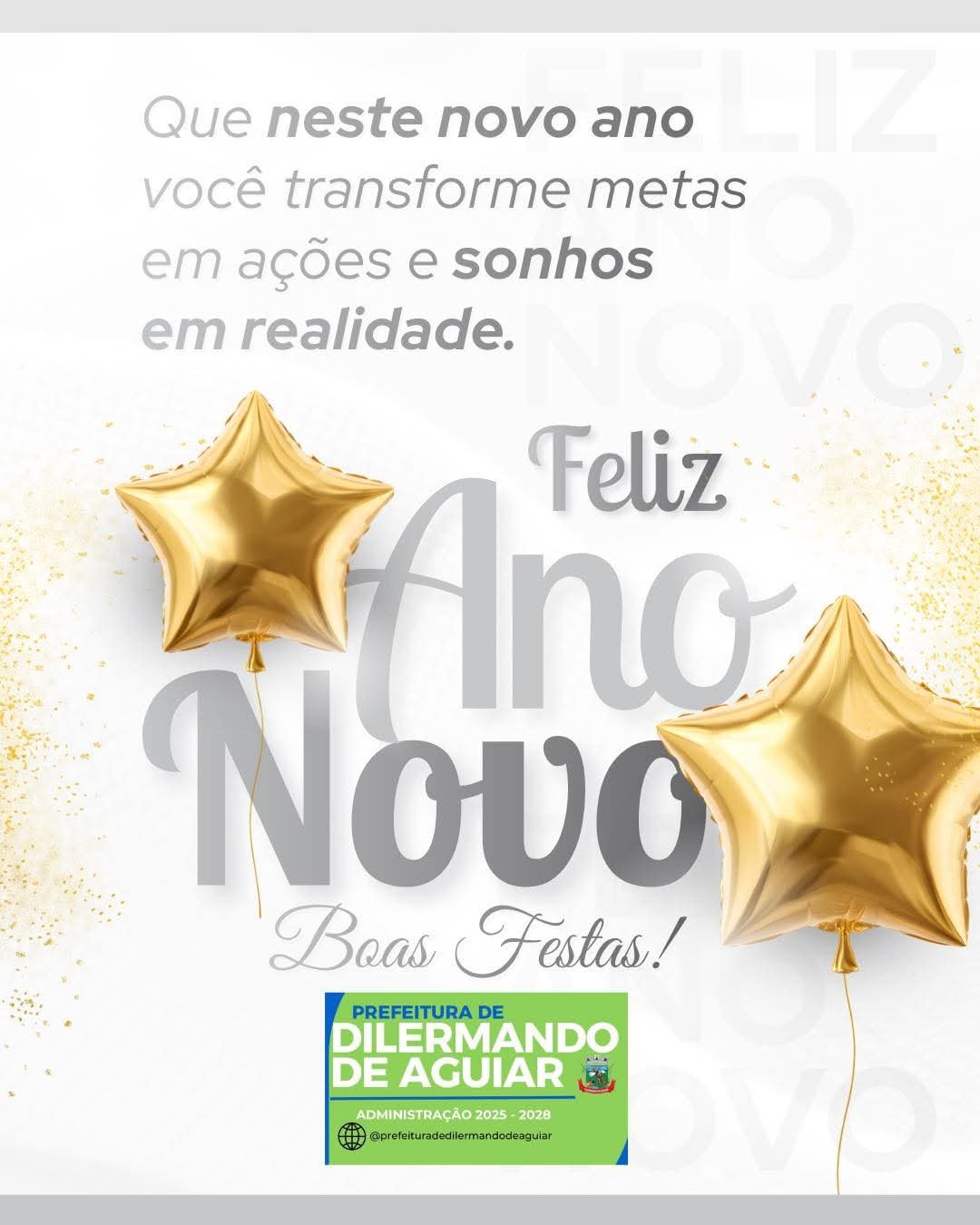 A Administração Municipal de Dilermando de Aguiar deseja a todos os cidadãos um Feliz Ano Novo, repleto de saúde, paz, esperança e conquistas. Que o novo ano traga renovação, união e força para continuarmos trabalhando juntos por um município cada vez melhor, com mais desenvolvimento, respeito e qualidade de vida para todos. Seguimos firmes, com compromisso, responsabilidade e fé no futuro.