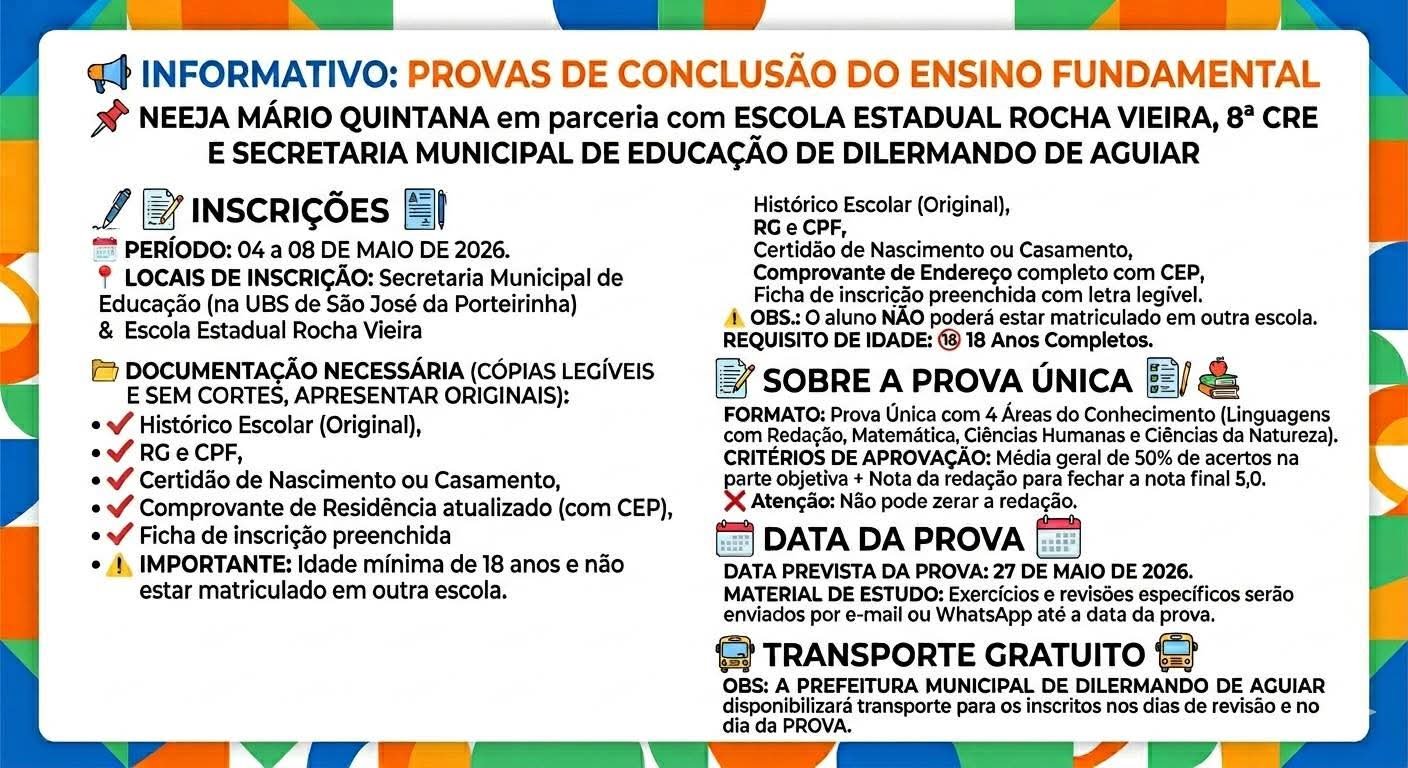 INFORMATIVO SOBRE AS PROVAS DE CONCLUSÃO DO ENSINO FUNDAMENTAL DO NEEJA MÁRIO QUINTANA, EM PARCERIA COM AS ESCOLA ESTADUAL ROCHA VIEIRA, 8ª CRE E SECRETARIA MUNICIPAL DE EDUCAÇÃO DE DILERMANDO DE AGUIAR.