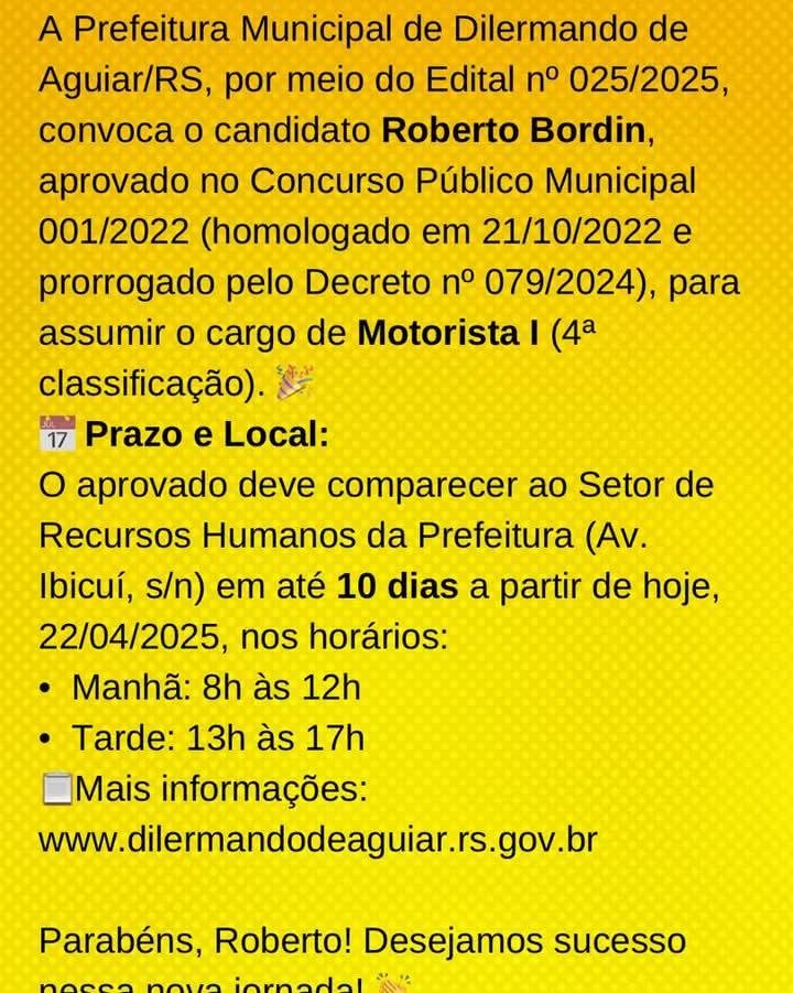 A Prefeitura Municipal de Dilermando de Aguiar/RS, por meio do Edital nº 025/2025, convoca o candidato Roberto Bordin, aprovado no Concurso Público Municipal 001/2022 (homologado em 21/10/2022 e prorrogado pelo Decreto nº 079/2024), para assumir o cargo de Motorista I (4ª classificação). 🎉