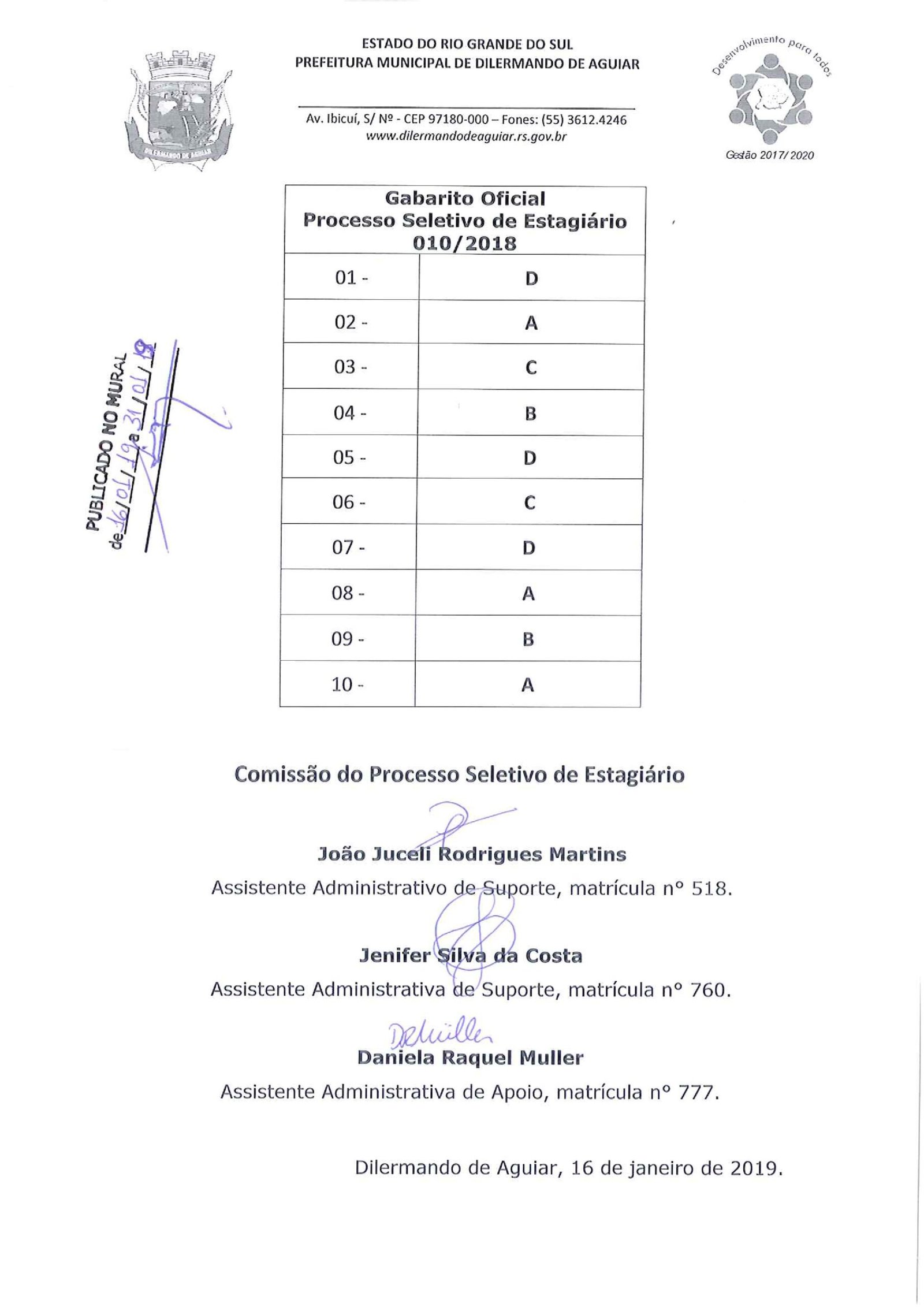 A prefeitura municipal de Dilermando de Aguiar divulgou nesta quarta-feira, 16, o gabarito das provas da seleção de estagiários. O exame foi aplicado na manhã de terça-feira, dia 15, na câmara de vereadores do município para os 11 inscritos. Entretanto, 4 candidatos não compareceram, totalizando uma abstenção de 36%.