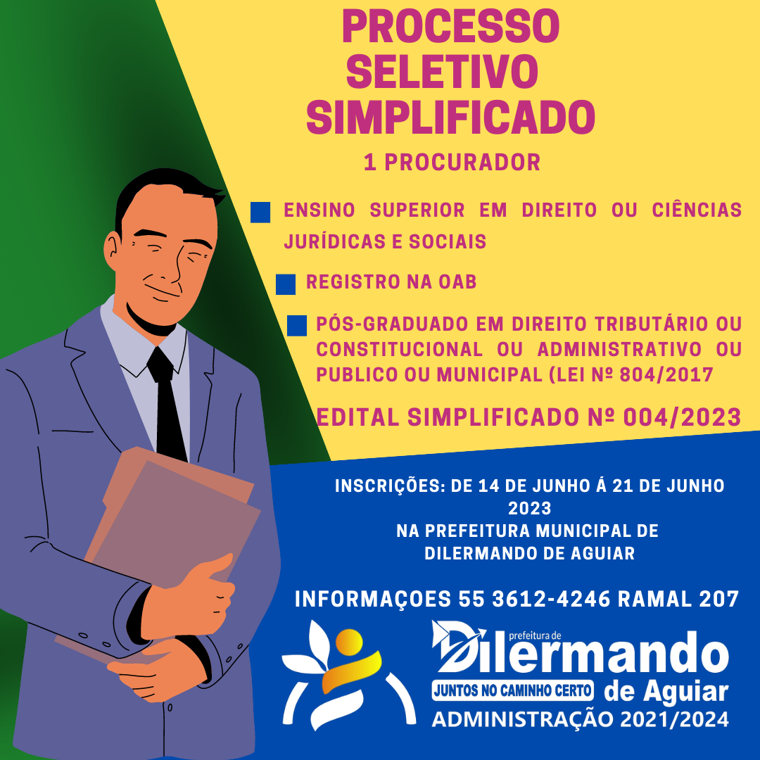 CONFIRA O EDITAL : https://www.dilermandodeaguiar.rs.gov.br/acesso-a-informacao/processo-seletivo/file/3239-edital-n-004-2023-de-processo-seletivo-simplificado