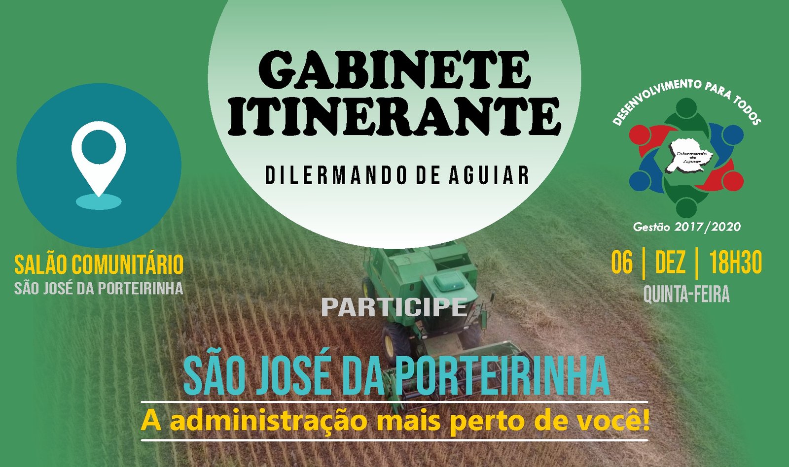 Na próxima quinta-feira, 06 de dezembro, a comunidade de São José da Porteirinha será a sede da administração municipal de Dilermando de Aguiar. A partir das 18h30, no salão comunitário, a comunidade terá a oportunidade de revindicar demandas e ouvir os membros da administração. O “Gabinete Itinerante” é um projeto desenvolvido pela administração municipal com o propósito de aproximar-se da população que não tem acesso frequente ao gabinete do prefeito ou às secretarias de governo, podendo, assim, dinamizar ações e colocar o Poder Público mais presente na realidade de cada cidadão.